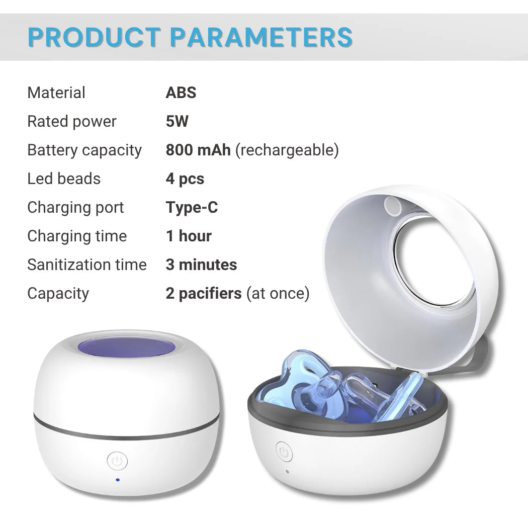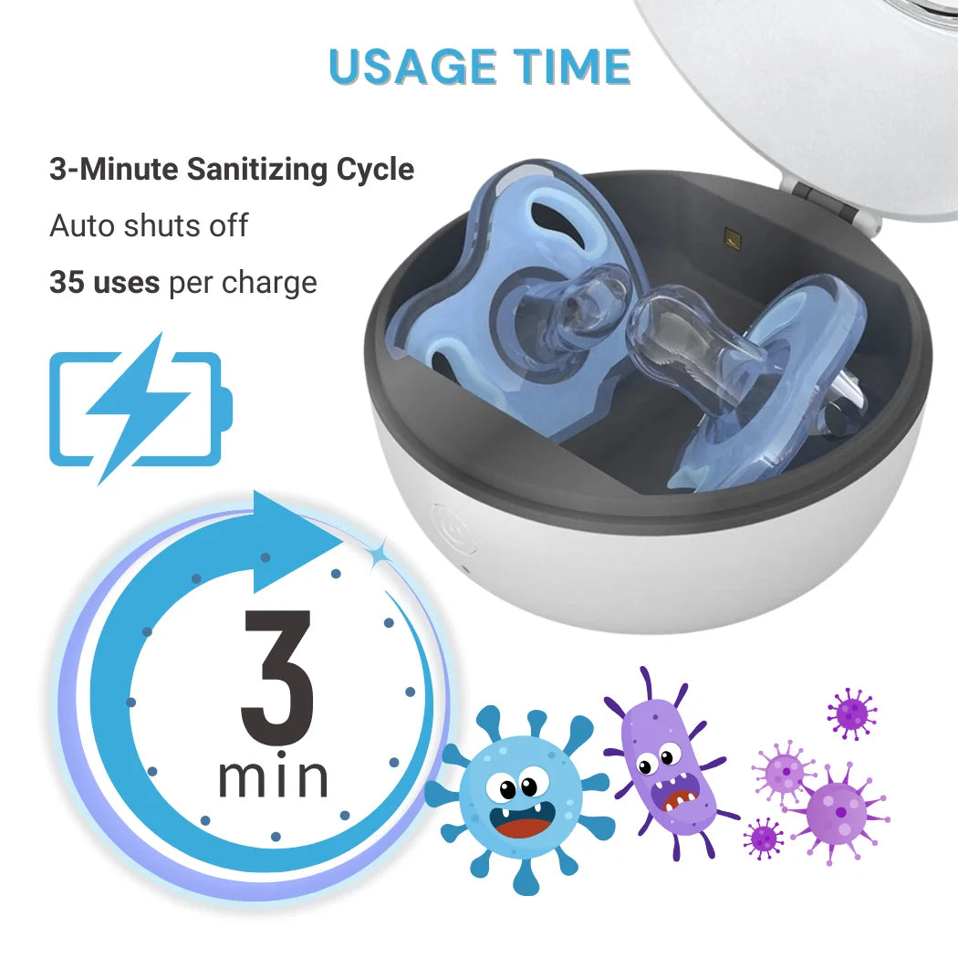 Say goodbye to harsh wipes and waiting for boiled water to cool. The Sterl Nest Portable Pacifier Sanitizer gives busy parents a smarter, faster way to sanitize pacifiers, bottle nipples, and even mouthguards without chemicals or mess. Designed with advanced UV-C light technology, it kills up to 99.9% of germs and viruses within just 3 minutes, all from a compact unit that fits effortlessly in your diaper bag or purse.